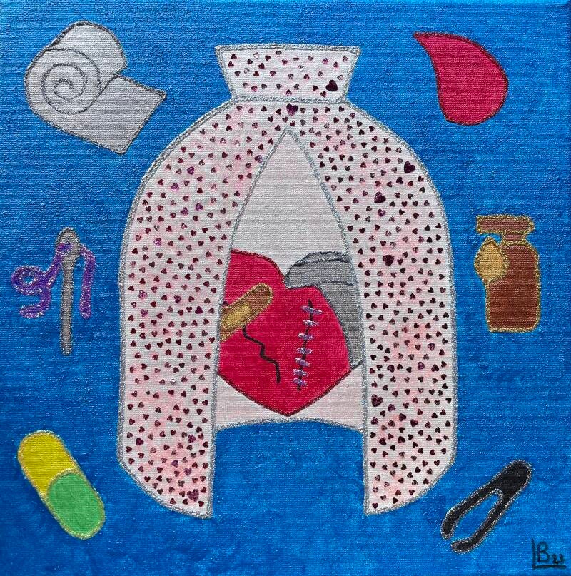Die erste Schicht, die strudelförmig aus dunklen Farben entstand und den Titel: "Ich fühle mich nicht gesehen von..." trug, beinhaltete Menschen, denen ich seit geraumer Zeit aus dem Weg gehe, weil die Begegnungen schmerzen könnten. Ich habe Angst, dass mich der Schmerz in einen Strudel hineinnehmen könnte und ich da nicht mehr rauskommen würde! Zum Schutz habe ich mir zusätzlich eine Mauer ums Herz gebaut!